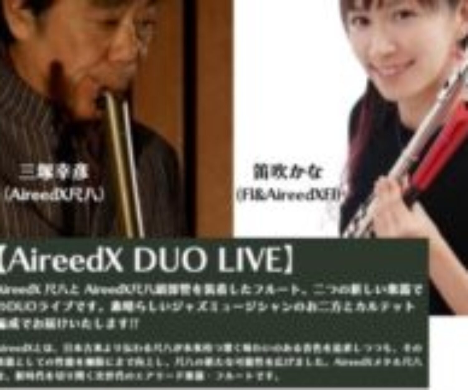 News 03 9月 2022 工房LIVE再開! 第一弾 AireedX DUO LIVE 笛吹カナさんと三塚幸彦による メタル尺八AireedXの頭部管をフルート装着用に開発したAireedX-F この頭部管を装着した漆塗りのフルートを演奏するのは笛吹カナさん! 三塚幸彦のAireedXとのDUO LIVEです! 笛吹カナさんのジャズアレンジによる山本邦山の壱越はぜひ聞いてほしい! コロナウィルスの蔓延でしばらく中止していた工房イベントの再開です。 皆様と楽しいひと時を過ごせれば幸いです。 2022年10月16日(日) 泉州尺八工房ショールーム 15:00 開演 3,000円 ご予約は 03-3480-2194 〒201-0004 東京都狛江市岩戸北1-7-15 AiereedX 三塚幸彦 AireedX Fl … 三塚