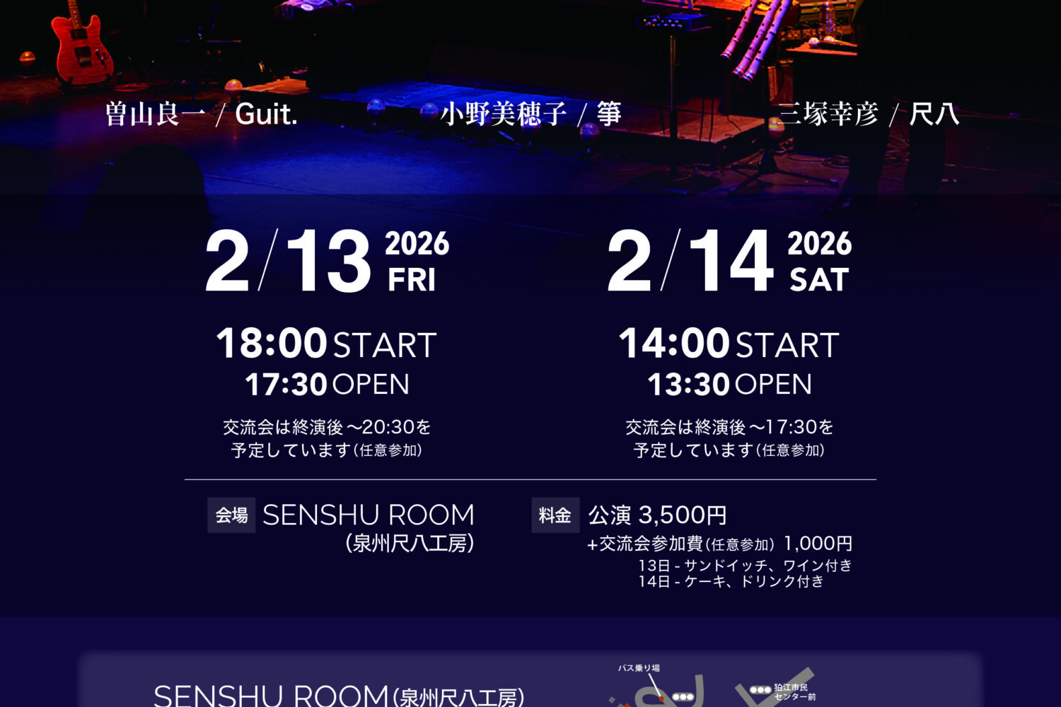 2026年2月13日(金)、14日(土)の両日泉州尺八工房SENSHU ROOMにて遠TONE音のコンサートを開催します。