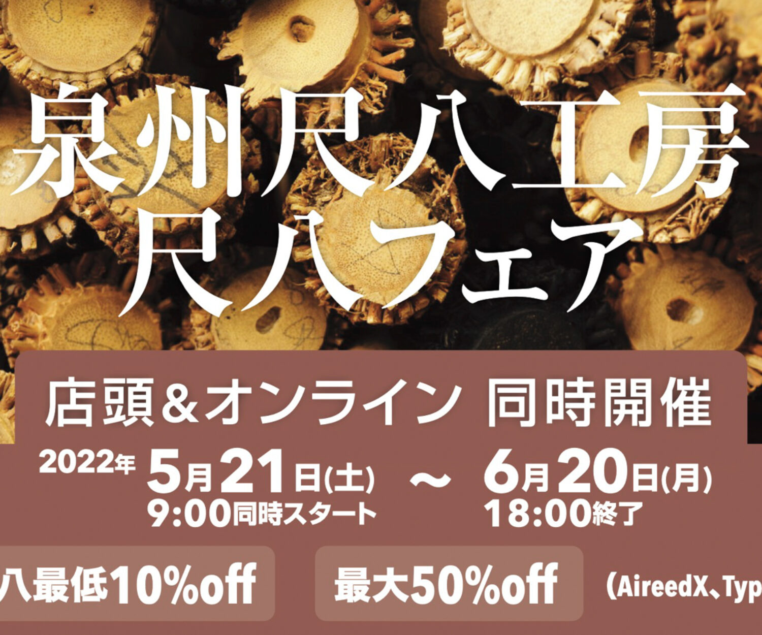 泉州尺八工房 尺八フェア 店頭&オンライン同時開催 期間2022年5月21 9:00〜 6/20 18:00まで 泉州尺八工房オリジナルTypeAとMetal尺八AireedXを含む全商品が最低限10%off 泉州尺八工房製の竹製楽器は最大50%off 店頭にお越し頂けない方は泉州工房オンラインショップにて全ての在庫の写真や三塚による試奏動画をご参考ください。 店頭では皆様のご判断に役立てるよう、三塚を始めとするスタッフが実際に吹いてお聞かせいたします。 ご要望により実施いたしますのでお気軽にお声がけください。 (コロナ対策に万全を期しています、試奏の前後にはアルコール消毒を徹底しますので皆様の何卒ご協力ください)